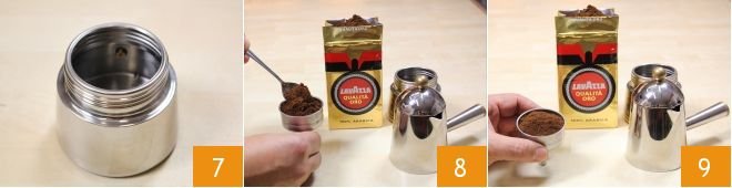 Meanwhile, prepare the coffee with the coffee maker: to get excellent coffee, fill the boiler of your coffee maker with cold water, preferably low in calcium, being careful not to exceed the safety valve 7 (otherwise you will get a longer coffee). Fill the filter with ground coffee forming a mound that you will level by tapping the filter on the table with decisive movements (8-9). Do not press with a spoon, nor make holes on the surface.
