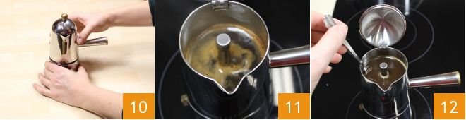 Close the coffee maker very tightly 10, so that the coffee does not spill from the sides as it rises, and place it over a low and steady flame to obtain a full-bodied coffee. As the coffee rises, a dense froth will form 11: we recommend not letting the coffee boil too long to maintain its sweetness and aroma. Your coffee is ready: before using it, stir it directly in the moka with a teaspoon to make the coffee more homogeneous 12.