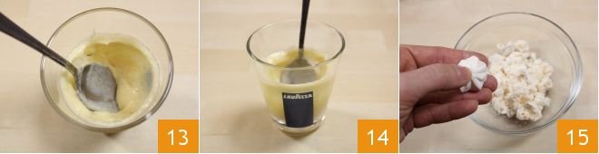 While the coffee is on the stove, put 2 tablespoons (about 1 oz) of well-chilled custard in each glass and spread it on the bottom and sides of the glass, covering 3/4 of the height of the glass (13-14). Crumble the meringues with your hands into rather large pieces 15.