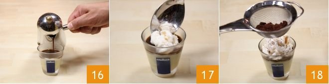 Pour the hot coffee until it completely covers the custard 16. Decorate the glass with a generous spoonful of broken meringues 17 and a dusting of unsweetened cocoa powder 18. Your meringue coffee is ready!
