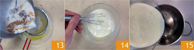 Finally, pour the now hot milk into the bowl, straining it through a sieve 13. Stir immediately 14 and return to the saucepan on the stove 15.