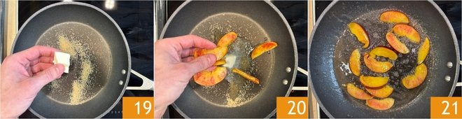 In a non-stick pan, melt some brown sugar with the butter 19, add the peaches 20 and sauté over medium heat for 5 minutes 21.