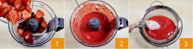 To prepare the red fruit meringues, start by cleaning the fruit. Rinse the raspberries and strawberries under running water, then remove the green leaves from the latter using a knife and cut them in half. Then place the raspberries and strawberries in the mixer 1, turn on the mixer to blend the fruit until you get a homogeneous pulp 3. Then filter it with a fine mesh strainer, using a spatula or a spoon to collect the sifted pulp in a small bowl 3. The pulp thus collected should weigh about 2.6 oz.
