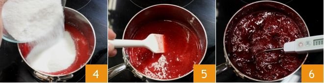 Then pass it into a small saucepan, add 3.5 oz of sugar 4 and light the fire, stirring to dissolve the sugar 5. Bring the pulp to 250°F 6, monitoring the temperature with a food thermometer. When the syrup reaches 239°F, start whipping the egg whites.
