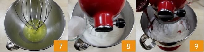 Pour the egg whites into the bowl of a stand mixer 7 and turn on the beaters (if you don't have a stand mixer, you can use an electric whisk). When they are semi-whipped, with the beaters still running, add 0.9 oz of sugar 8. Whip again to incorporate the sugar, then when the syrup has reached 250°F, add it in a stream to the whipped egg whites 9, continuing to run the beaters until you create a homogeneous, frothy and completely cold mixture.