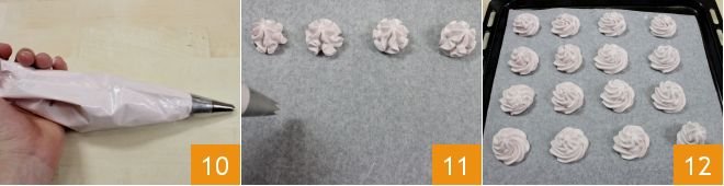 When the cream is ready, transfer it to a piping bag with a star nozzle 10. Line a baking sheet with parchment paper and start creating dollops of meringue, spacing them a couple of inches apart from each other 11. When you have finished all the dough 12, bake in a static oven at 212°F for 3 hours, until the meringues are firm and slightly colored underneath. Unlike the French meringue (basic dough), this meringue remains a little soft on the outside and crunchy on the inside.