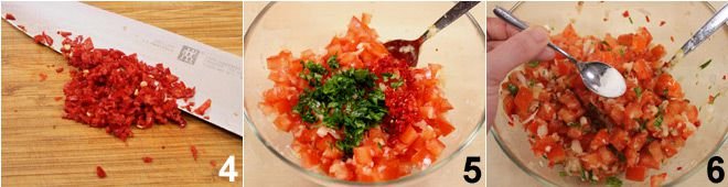 Wash, dry, and chop the cilantro, wash the chili peppers, remove their seeds, and finely chop them 4, then add these ingredients to the bowl 5 along with the sugar 6; gently stir to dissolve the sugar, then add the salt, mix, cover with plastic wrap, and let it marinate in the refrigerator for at least 3 hours before serving.