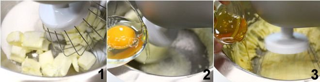 To prepare the Mickey and Minnie whoopie pies, start by whipping the softened butter with sugar 1 using electric beaters. Then add the egg 2 and continue whipping the mixture, also adding honey 3 and the vanilla bean seeds.