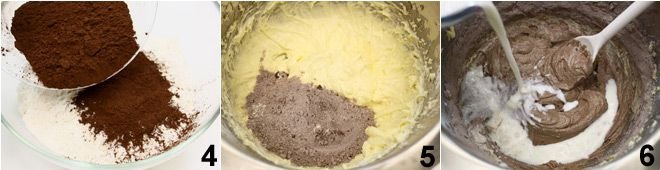 Sift the flour with cocoa, baking powder, baking soda, and salt 4 and add half of it to the previously prepared mixture 5, blending it with a wooden spoon; then add half of the warm milk 6.