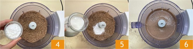 Add the baking powder 4 and the milk 5. Then blend again to mix everything well 6.