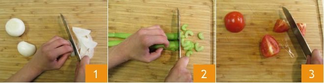 To prepare the mille-feuille of caponata, start with the caponata itself. Our advice is to prepare it the day before. Clean the onion and slice it thinly 1, then slice the celery 2, and finally cut the tomato into large pieces 3