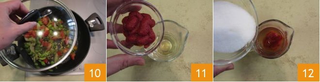 give it a good stir, and cover with a lid 10. Let it cook for about 15 minutes. Meanwhile, prepare the sweet and sour sauce by mixing vinegar, tomato paste 11, and sugar in a bowl. Mix well 12.