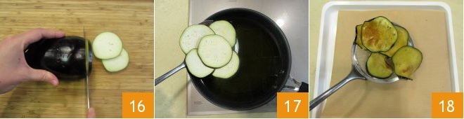 and move on to the eggplants. After washing and drying them, trim and thinly slice them 16. Then immerse a few slices at a time in a pot full of boiling oil 17, as soon as they are golden, drain them on absorbent paper and let them cool 18.