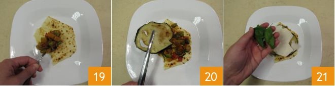 Then move on to the assembly. On the serving plate, place a sheet of guttiau bread, a few spoonfuls of caponata in the middle 19, then some slices of fried eggplant 20, the salted ricotta, and basil leaves 21
