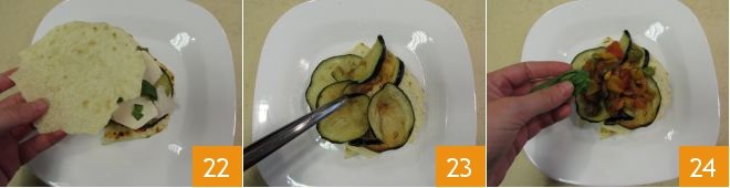 and repeat. Then guttiau bread 22, eggplants 23, caponata, and basil 24.