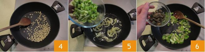 the pitted olives 7 and the toasted pine nuts 8. Then add the tomatoes and a pinch of salt 9,