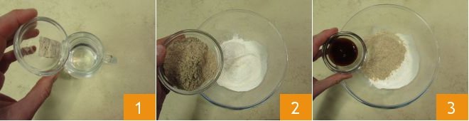 To prepare millet focaccia, first dissolve the yeast in room temperature water 1. In a bowl, combine all-purpose flour, bread flour, and whole millet flour 2; add the malt 3