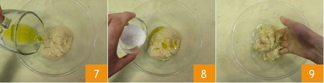 Add the oil 7 and salt 8. Knead again until fully absorbed 9.
