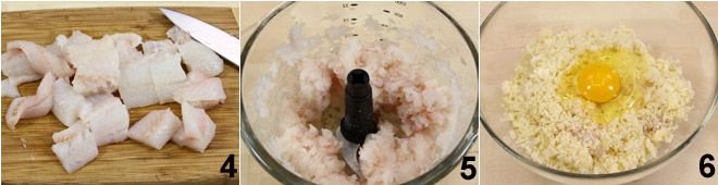 In the meantime, remove any bones from the fish, cut it into pieces 4, and chop it with the blades of a mixer 5. Place it in a bowl, add the crushed garlic clove, breadcrumbs, Parmesan, egg 6, salt, pepper (if desired),