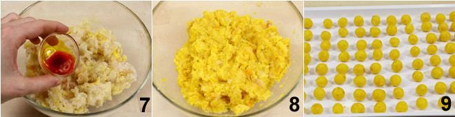 dissolve the saffron in a tablespoon of water 7 and mix well. Once you have obtained a bright yellow mixture 8, form very small meatballs 9 (the size of a marble).