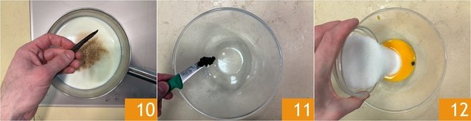 To prepare the custard, extract the seeds from the vanilla bean, then bring the milk to a boil with the lemon zest, the vanilla bean, a pinch of ground cinnamon, and a pinch of salt 10. Meanwhile, in a bowl, combine the vanilla seeds 11, egg yolks, and sugar 12.