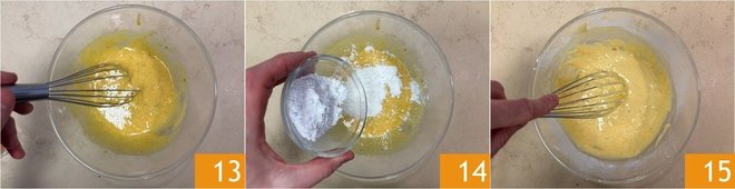 Mix with a whisk 13, then incorporate the corn starch and rice starch 14 and blend everything well 15.