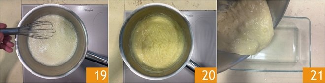 Cook the cream over medium heat, stirring constantly 19, until it has thickened 20. Pour the cream into a baking dish 21, cover with cling film in contact with the surface, and let it cool to room temperature for 30 minutes. Then transfer it to a piping bag without a nozzle and refrigerate for at least 3 hours.