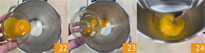 To prepare the sponge cake, in the stand mixer with electric whisks, add the sugar, egg yolks 22, whole eggs 23, and a pinch of salt. Whisk for at least 10 minutes 24.