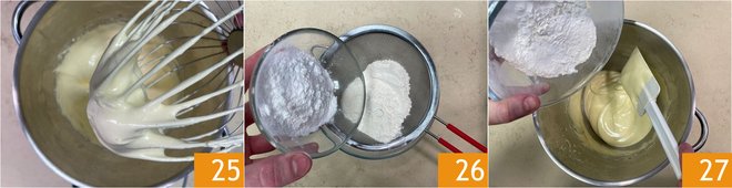 You should obtain a light and fluffy mixture 25. In a separate bowl, sift the flour and the potato starch a couple of times 26, then gradually incorporate the powders into the whipped mixture, stirring gently with a spatula from bottom to top to prevent it from deflating 27.