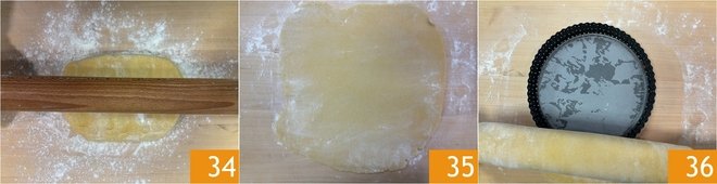 After the shortcrust pastry has rested in the refrigerator, roll it out with a rolling pin on a floured work surface 34 to a thickness of about 1/4 inch 35. Butter and flour a 10-inch diameter pan, at least 1.5 inches high, and line it with the shortcrust pastry, first wrapping it around the rolling pin and then unrolling it onto the pan 36.