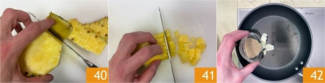Clean the pineapple and cut out 7 oz of pulp 40, then dice into small cubes 41. In a pan, melt the butter and brown sugar 42.