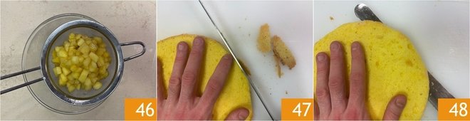 Drain the pineapple cubes and let them cool completely 46. Meanwhile, using a serrated knife, remove the outer crust of the sponge cake 47. Cut the sponge cake horizontally in half to obtain a 3/8 inch thick disc 48.