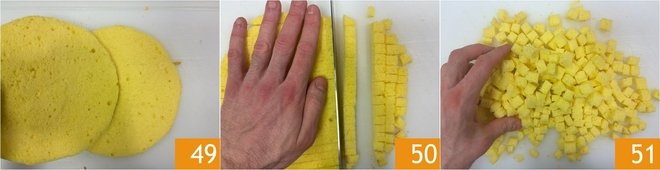 You will obtain 2 discs 49. Cut one disc into approximately 3/8 inch cubes 50, creating mimosa flowers 51.