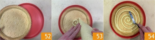 Place the cooled shortcrust base on a serving platter 52, then spread half of the custard on the bottom 53 using a spatula 54.