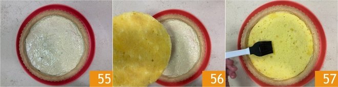 You should have an even layer 55. Brush one side of the second 3/8 inch thick sponge cake disc with syrup, then place it on top of the cream, with the moistened side facing down 56, then brush it with rum syrup on the other side as well 57.