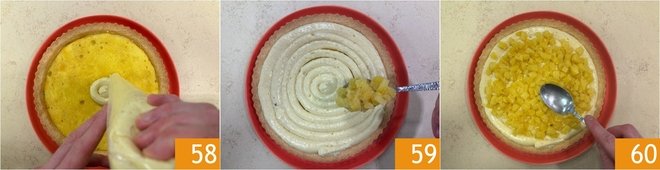 Spread the remaining custard 58, then add the caramelized pineapple cubes 59 and level everything with the back of a spoon 60.