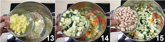 At this point, you can slowly add all the vegetables: the potatoes 13, celery, carrot, and zucchini 14, then the beans 15, and stir with a wooden spoon.