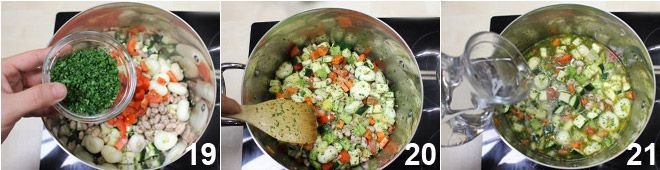 finally add the parsley 19, stir with a wooden spoon 20, and add enough water to cover all the vegetables 21 and salt. Cover with a lid and let it cook on low heat for 40 minutes.