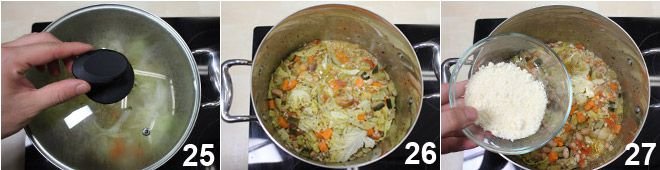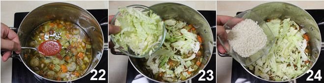 After this time, add the tomato sauce 22, the cabbage 23, and the rice 24.