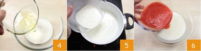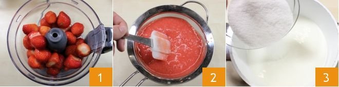 In a separate bowl, pour the fresh liquid cream, add the egg whites 4, and mix with a whisk. When the sugar has dissolved, add the cream and egg whites mixture 5 and bring everything to a temperature of 181°F to pasteurize the milk and egg whites. Once the temperature is reached, remove the saucepan from the heat, transfer the mixture to a bowl, and cool it quickly: to do this, you can place the bowl in a large container filled with ice and stir continuously. When the mixture is well chilled, incorporate the strawberry pulp 6