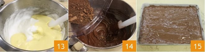 Also whip the egg whites to soft peaks (so that no lumps form when you combine them with other ingredients) along with the remaining sugar, then combine the two mixtures with a spatula without deflating them, stirring from the bottom up 13. Gently add the sifted flour together with the cocoa powder and mix the batter 14. Spread the batter on a buttered 8x12 inch baking sheet lined with parchment paper, level it with a flat and smooth spatula until it reaches a thickness of 0.4 inches 15. Bake in a preheated static oven at 428°F for 6-7 minutes (or in a fan oven at 392°F for 4-5 minutes).