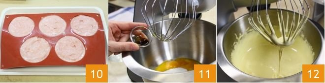 take the ice cream out of the freezer, remove the domes from the mold 19, and place them on the cookies 20. Put the domes back in the freezer and focus on the Italian meringue by following the procedure found Italian Meringue: in a small pot, pour the sugar, add the water, and over low heat stir to dissolve the sugar; when the syrup forms, immerse the appropriate thermometer, which will indicate the temperature to reach, i.e., 248°F. When the syrup reaches 239°F 21, start whipping the egg whites at medium speed.