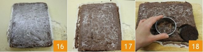 Remove the sponge cake from the oven, immediately remove it from the pan, placing it with all the parchment paper on a surface. Immediately dust the surface of the sponge cake with granulated sugar and seal it immediately with cling film 16 so that it doesn't become too brittle once cold. When the sponge cake is cool 17, use a cookie cutter with a diameter of 3 inches to cut out circles of cake that will form the base of the dessert, place them on a tray 18