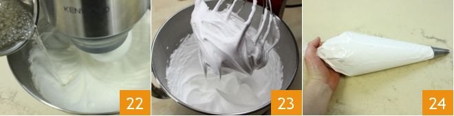 When the syrup has reached the above temperature, pour it in a thin stream into the egg whites 22, continuing to whip with the beaters not only until the syrup is used up but also until the meringue has completely cooled. The obtained meringue should be very dense, smooth, and shiny 23. Transfer the meringue into a piping bag fitted with a star tip 24,