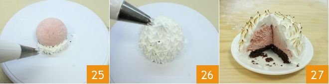 remove the desserts from the freezer and garnish the entire surface with meringue dollops (25-26). Finally, bake the mini baked Alaska at maximum power for just 2 minutes, just enough to brown the surface 27, and serve these delights immediately!