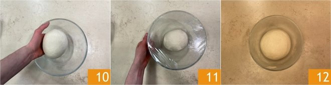 Shape the dough into a ball by rolling it, then place it in a bowl 10. Cover with plastic wrap 11 and let rise for 2 hours in the oven with only the light on, until it has doubled in size 12.