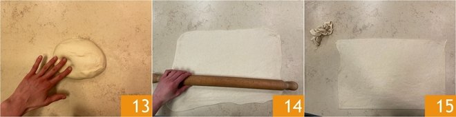 Once risen, transfer the dough to a work surface and flatten it with your hands 13. Roll it out with a rolling pin to form a rectangle 14 and trim the edges if uneven 15.