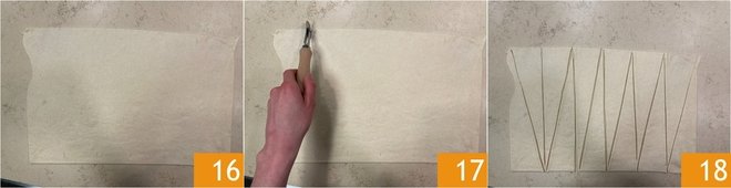 The final rectangle should be approximately 16.5x11 inches 16. Make marks on both long sides of the rectangle every 2.75 inches 17, then use a pastry cutter to cut 12 triangles with a base of 2.75 inches 18.