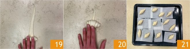 Starting from the wider side, begin rolling the brioche, gently pulling the tip to lengthen it 19. Continue rolling gently 20, ensuring the seal is on the bottom. Transfer each brioche onto squares of parchment paper and place them on a baking sheet or tray 21. Let the brioche rise in the oven with only the light on, for about 30 minutes.