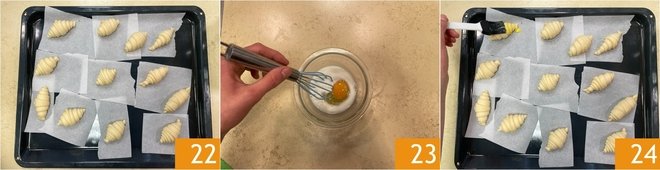 Once the brioche have risen 22, beat the egg together with the milk 23 and use it to brush the first 4 brioche 24.